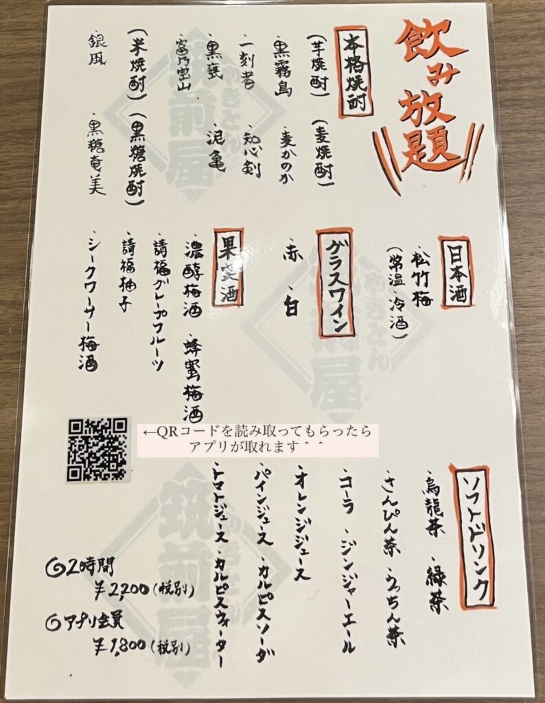 | 飲み放題 | 2時間 2,200円(税別) 2時間:アプリ会員 1,800円(税別) 延長1時間 900円 |