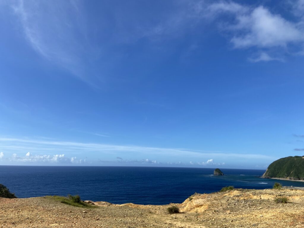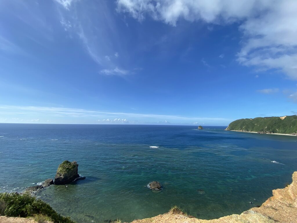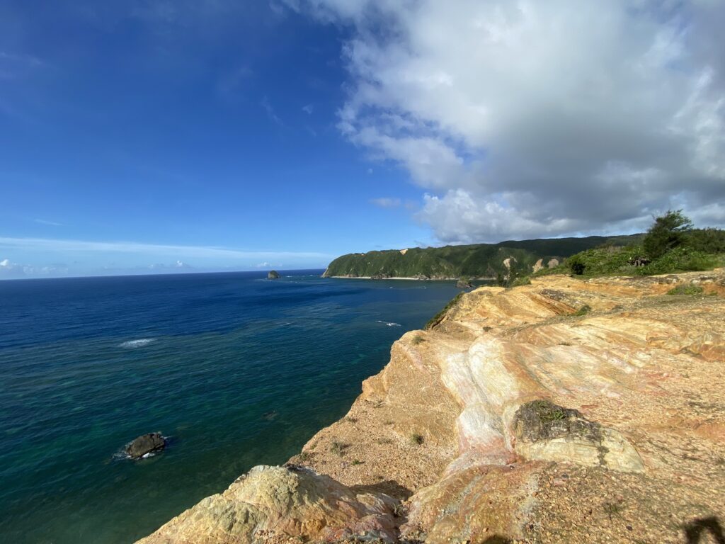 岩肌に囲まれた砂浜を見下ろすと、まるで神様の遊び場みたいさぁ。水平線が果てしなく広がって、まるで世界の果てに来たみたい。ここに来たら、パワーがみなぎってくるよ〜。疲れた心も「はいさい、元気出すさぁ〜!」って感じさ。